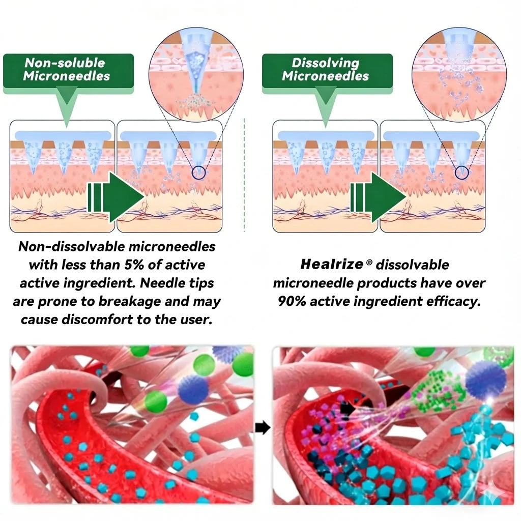 Healrize is designed for high-efficiency delivery with ultra-thin 0.27 mm micro-darts (about 1/7 the thickness of a human hair). They dissolve in the skinโs upper layers and release actives graduallyโno swallowing and no digestion-dependence, so you wonโt experience common side effects.
